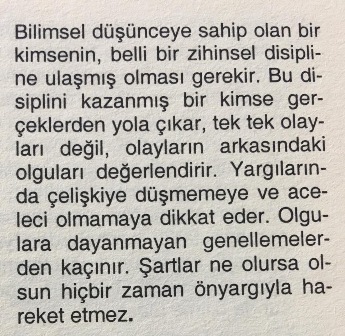 Artık okullarımızda bilgileri birbiri ardına sıralama veya başkalarının görüşlerini ezberletmek yerine bilimsel düşünme yöntemlerini öğretmeye başlamak zorundayız. Bir toplumun gelişmesinde temel şart, analitik düşünen kuşaklar yetiştirmektir.