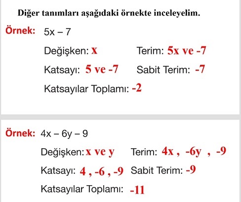 Teknik terimler: katsayı, değişken, sabit sayı, ifade, terim