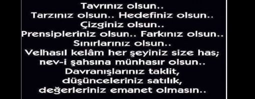 * Tavrınız olsun, tarzınız olsun, hedefiniz olsun, çizginiz olsun, prensipleriniz olsun, farkınız olsun, sınırlarınız olsun.Her şeyiniz şahsınıza münhasır olsun.Davranışlarınız taklit, düşünceleriniz satılık, değerleriniz emanet olmasın...