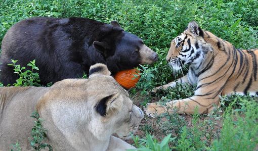 Kaplan çıkmış sahneye de gelmiş ayıyla aslan arkadaşının yanına.